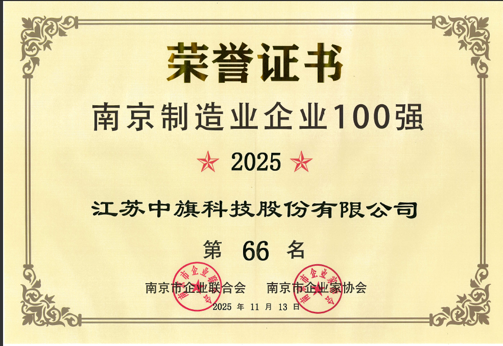 2025年11月13日,“南京市制造業(yè)百強企業(yè)”榜單正式發(fā)布,中旗股份憑借過去一年在經(jīng)營業(yè)績、創(chuàng)新能力及綜合實力上的卓越表現(xiàn),再次成功入選,這是中旗股份自2019年連續(xù)7年入選。