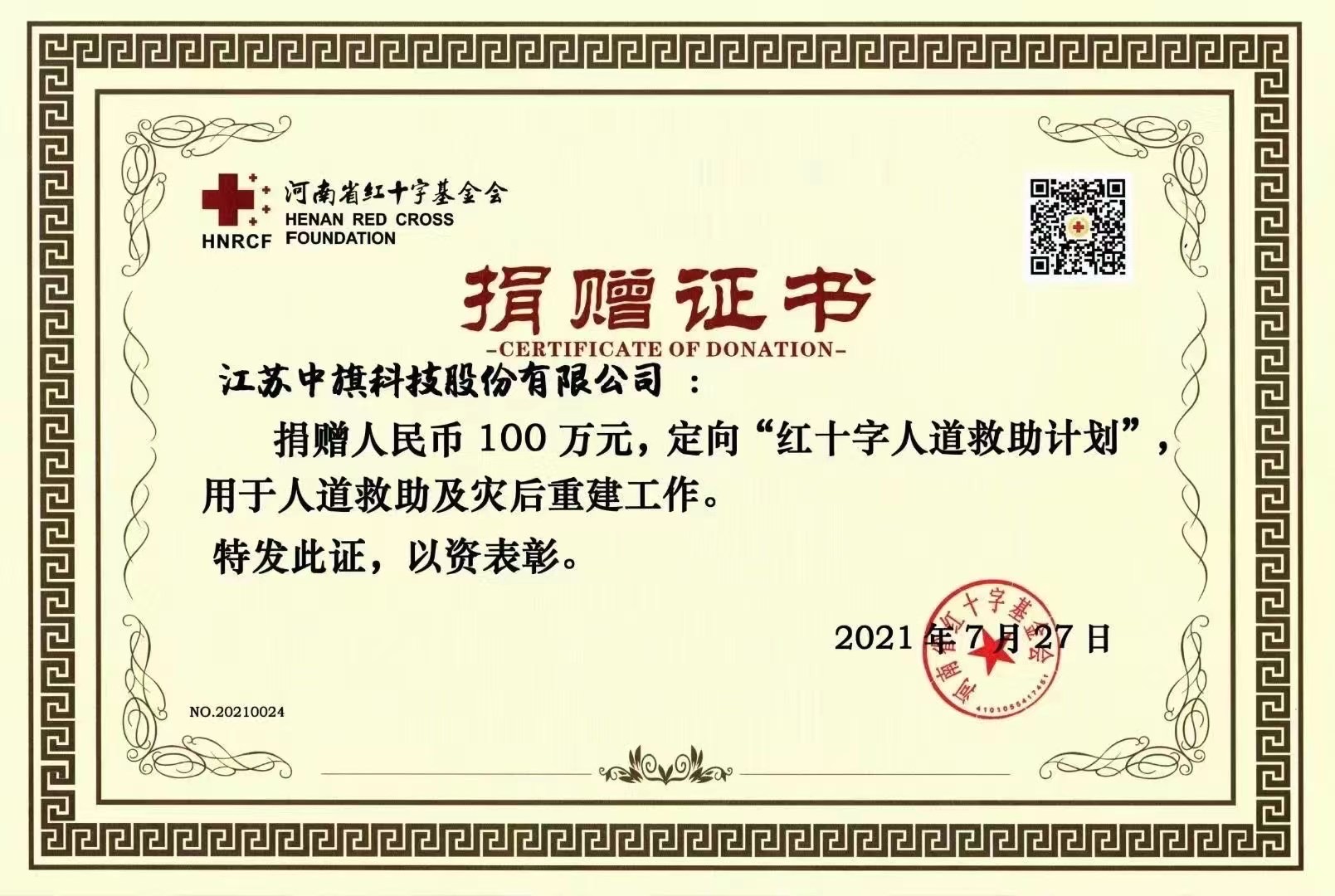 中旗科技心系災區,經董事會決議通過向河南省紅十字基金會捐贈100萬元,定向“紅十字人道救助計劃”。